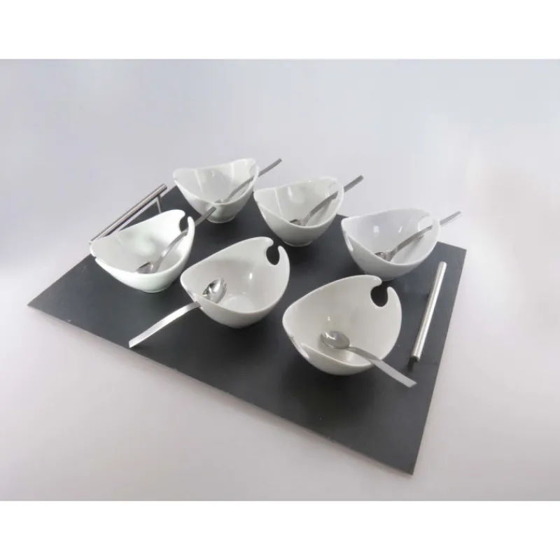 Cet ensemble associe simplicité et modernité par l’harmonie du blanc des coupelles et du noir de l’ardoise, surmonté de légères teintes argentées des poignées et des cuillères.