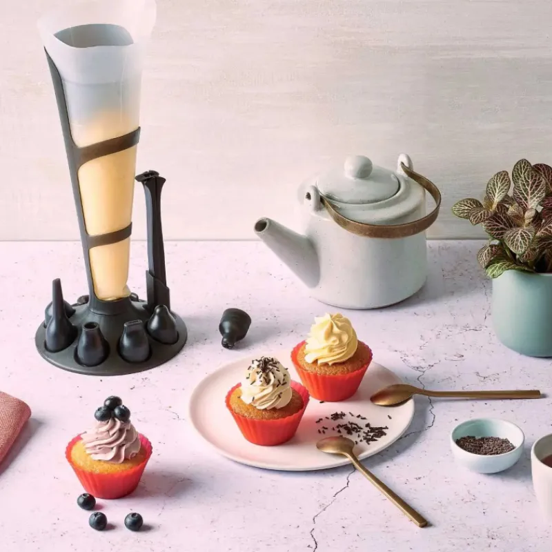Les 12 douilles inox inclues vous permettent de varier les plaisirs avec des formes de pochages multiples : étoile, ronde, rose, pétale… Il y en a pour tous les goûts. Le support vertical pratique et les accessoires comme le goupillon de nettoyage, la pince et le bouchon hermétique rendent ce kit encore plus pratique et facile à utiliser.