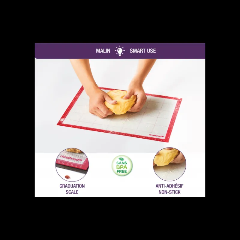 Le Tapis de Cuisson est l’élément que tout cuisinier amateur ou professionnel devrait avoir dans ses placards ! Indémodable, il est un excellent substitut au papier de cuisson traditionnel pour cuire vos pâtes compactes, vos macarons ou encore vos biscuits. En effet, le Tapis de Cuisson Silicone Mastrad est multi-fonctions ! Ce tapis de pâtisserie est idéal pour travailler le sucre ou la nougatine. Il sert également de base pour malaxer ou étaler vos préparations sucrées et salées. Mais ce n’est pas tout, puisque le tapis de cuisson est doté de graduations et de quadrillages facilitant vos découpages. Ainsi, vous pourrez former avec précision de superbes triangles qui deviendront par la suite de moelleux croissants.