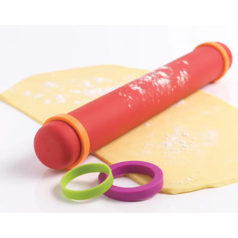 Pratique ! Voici un rouleau à pâtisserie ajustable. Grâce à 4 paires d’anneaux, vous allez pouvoir choisir l’épaisseur de pâte voulu. Il suffit de fixer de chaque côté du rouleau la paire d’anneaux de la hauteur voulu. Ainsi pour les pâtes fraîches, prenez les plus petits anneaux pour obtenir une pâte de 2mm d’épaisseur. Pour les cookies, obtez plutôt pour une épaisseur de 4 mm, pour la pâte à tarte 6mm et pour de bonnes pâtes à pizza l’épaisseur 8 mm sera parfaite.