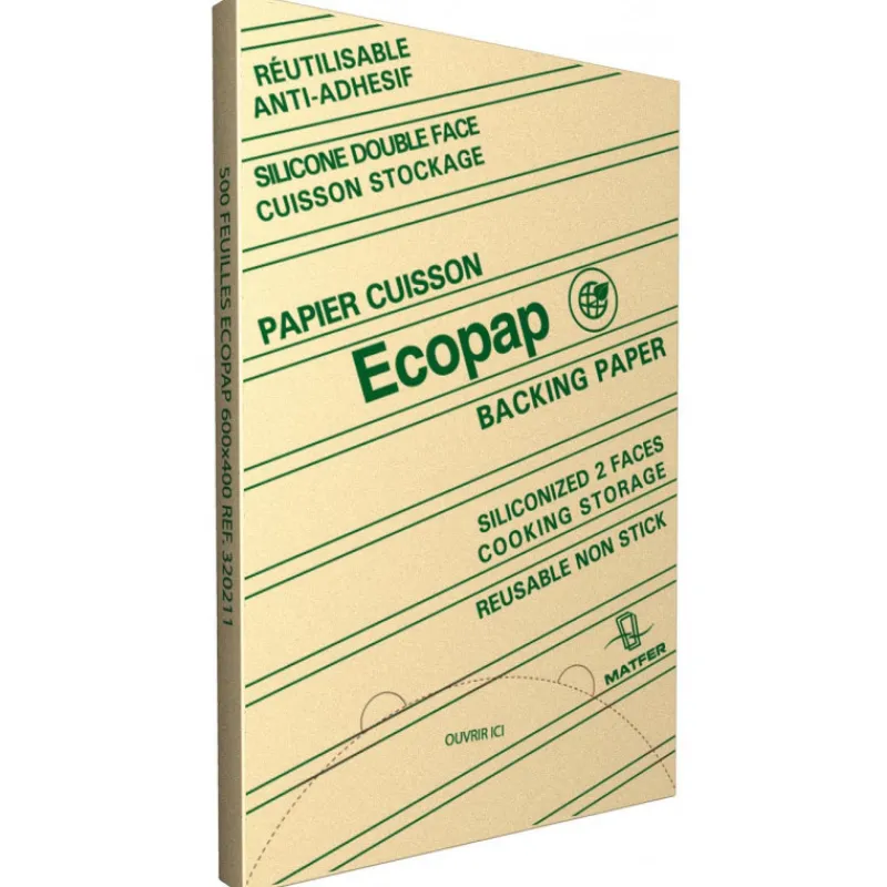 Ces feuilles de cuisson conditionnées dans une boîte distributrice par 500 mesurent 60 x 40 cm. Elles résistent à des températures allant jusqu’à 250°C et peuvent être utilisées 8 fois suivant les conditions de cuisson. Egalement siliconés sur les deux faces, le papier cuisson Ecopap est anti adhérent.