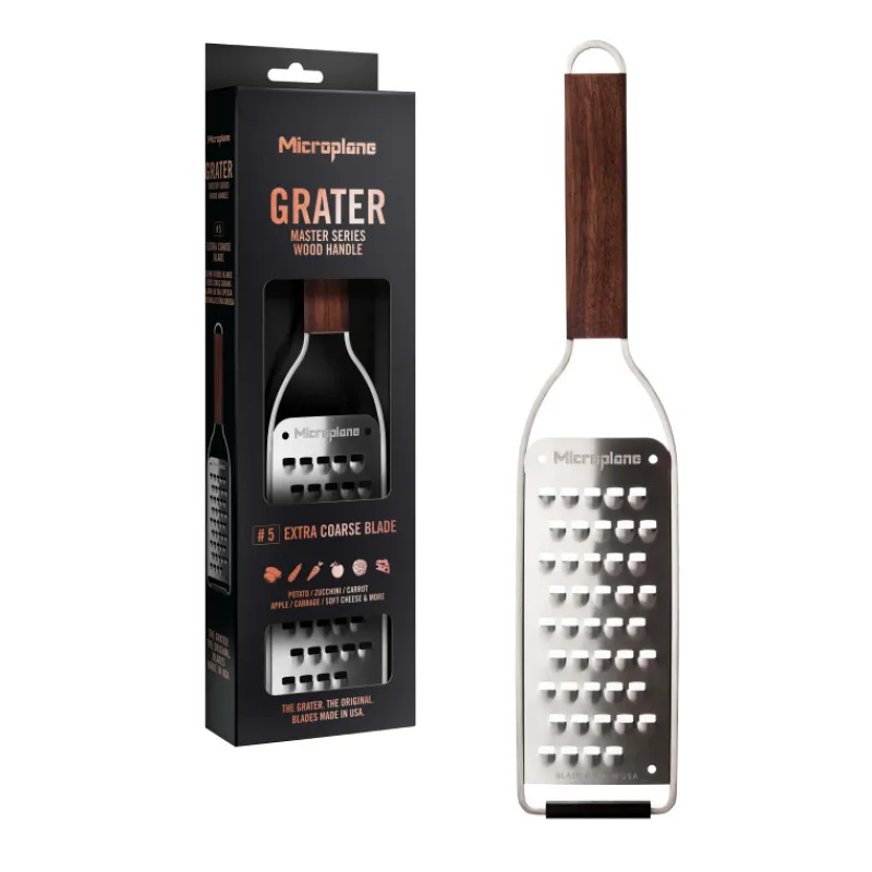 Chaque râpe de cuisine de la gamme Microplane Master se distingue aisément grâce à son élégant manche en noyer et à sa lame brillante en acier inoxydable de haute qualité. Ce style unique fait de cette collection non seulement des râpes de qualité professionnelle, mais également des ustensiles de cuisine sublimes qui ajouteront du charme à votre cuisine.