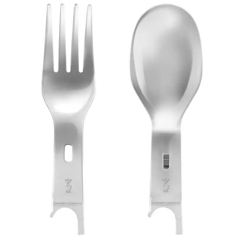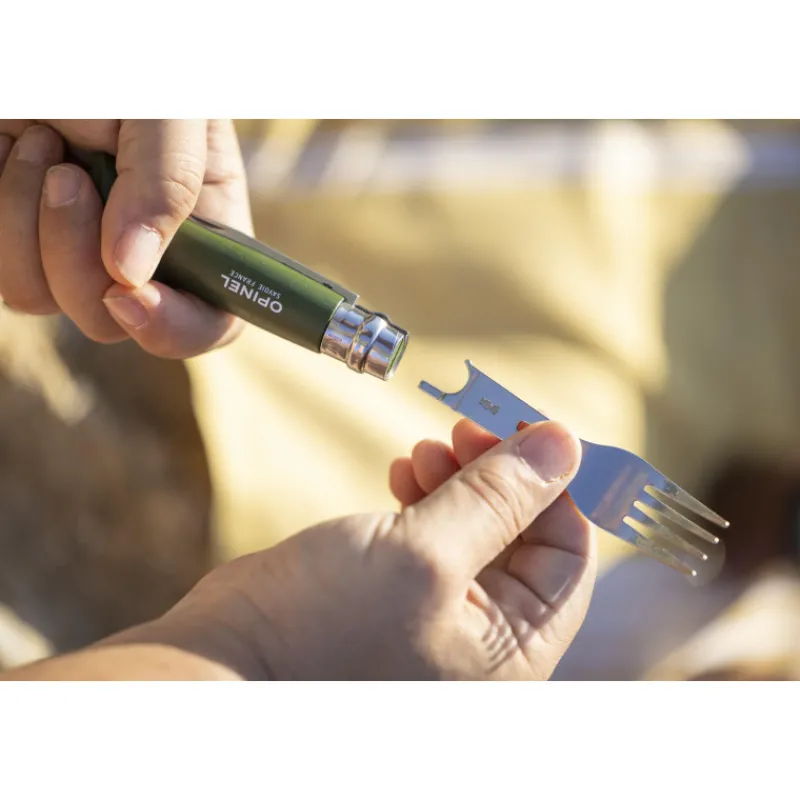 Ce kit pour pique-nique comprend un insert en forme de fourchette et un insert en forme de cuillère qui s’adaptent au couteau de poche N°8 muni d’une bague de sécurité. Il vous suffit de tourner la bague en position ouverte, placer l’insert de votre choix dans l’interstice du couteau, puis tourner la bague à nouveau pour la fermer. Ces gestes faciles vous permettront d’échanger en un clin d’œil votre couteau pour une cuillère ou une fourchette.