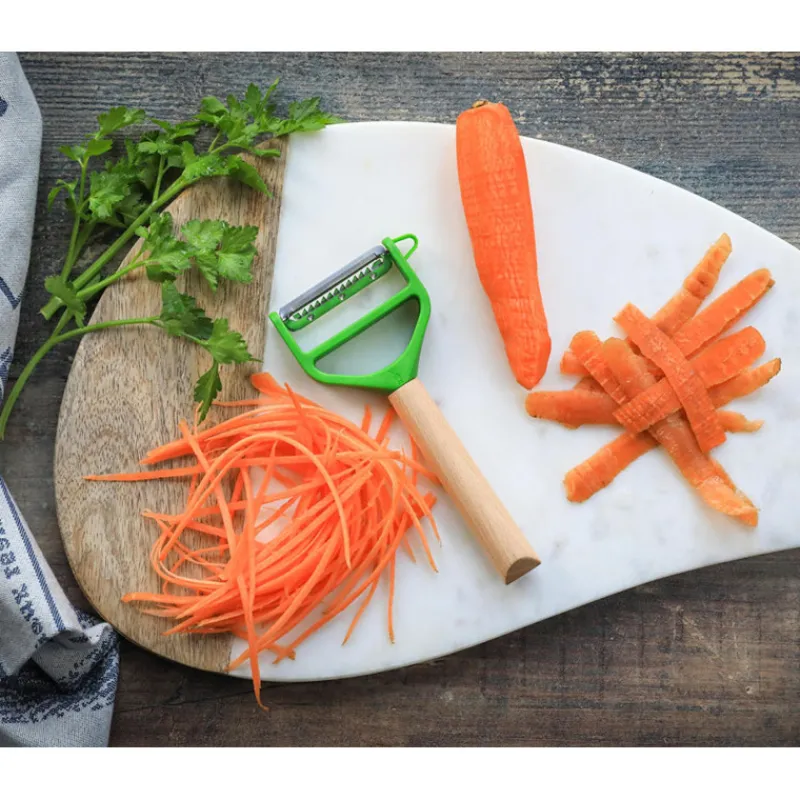 Avec ses deux lames en inox, cet épluche légumes permet non seulement de peler fruits et légumes, mais aussi de les découper à la façon d’une julienne. La lame micro dentée et robuste de l’éplucheur Opinel viendra à bout des peaux même les plus dures de vos ingrédients.