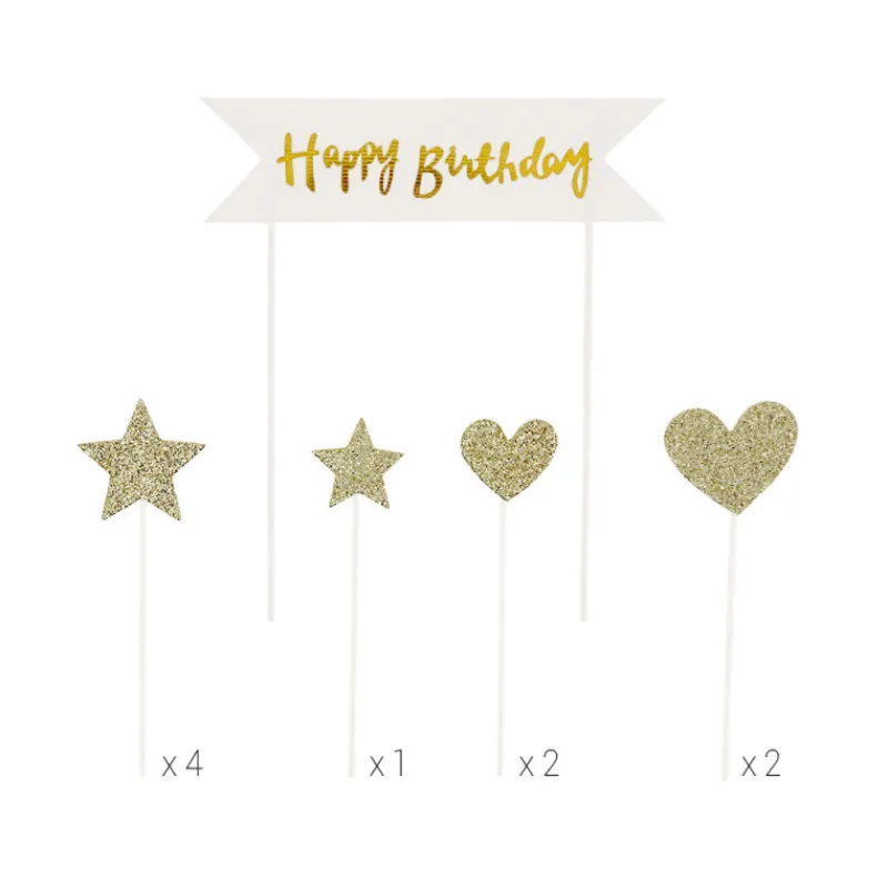 Cake Topper Happy Birthday Cœurs et Étoiles Dorés (x10) Patisdécor
