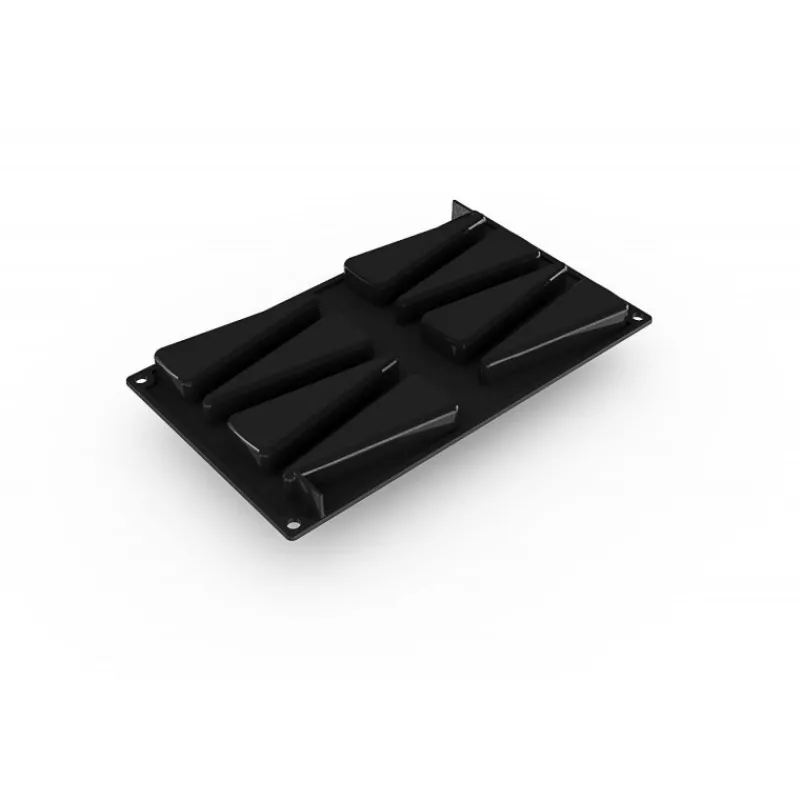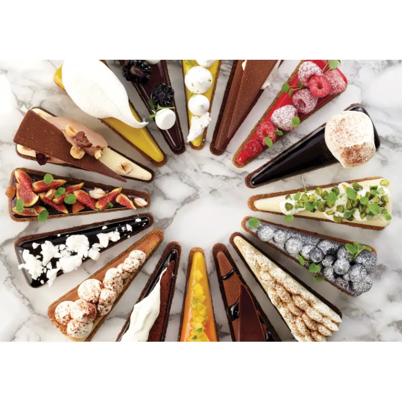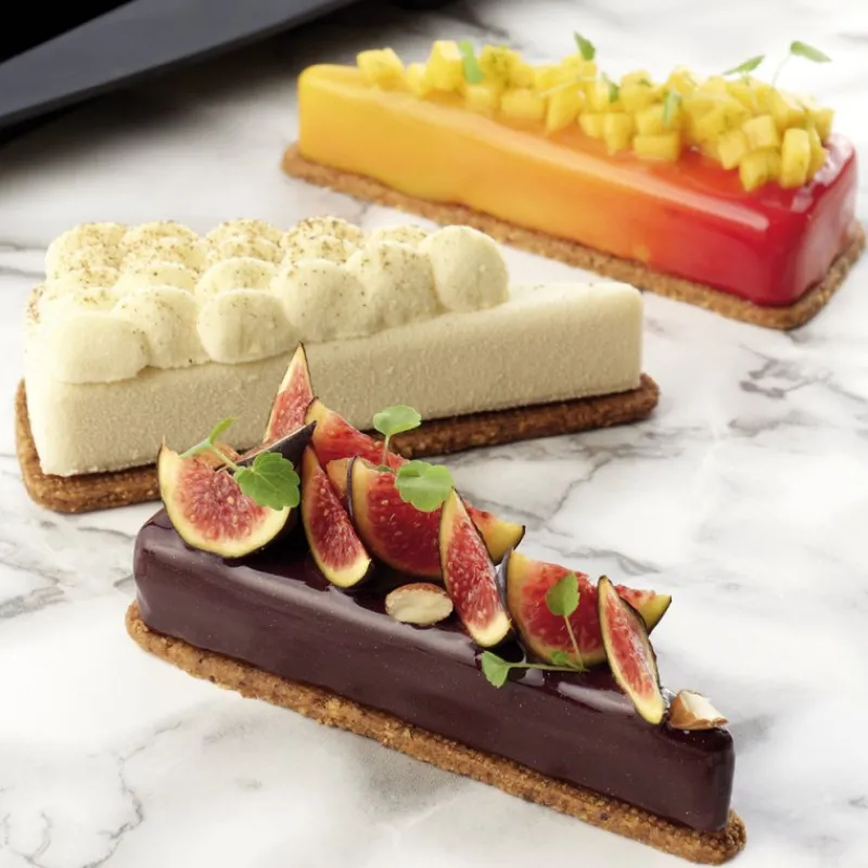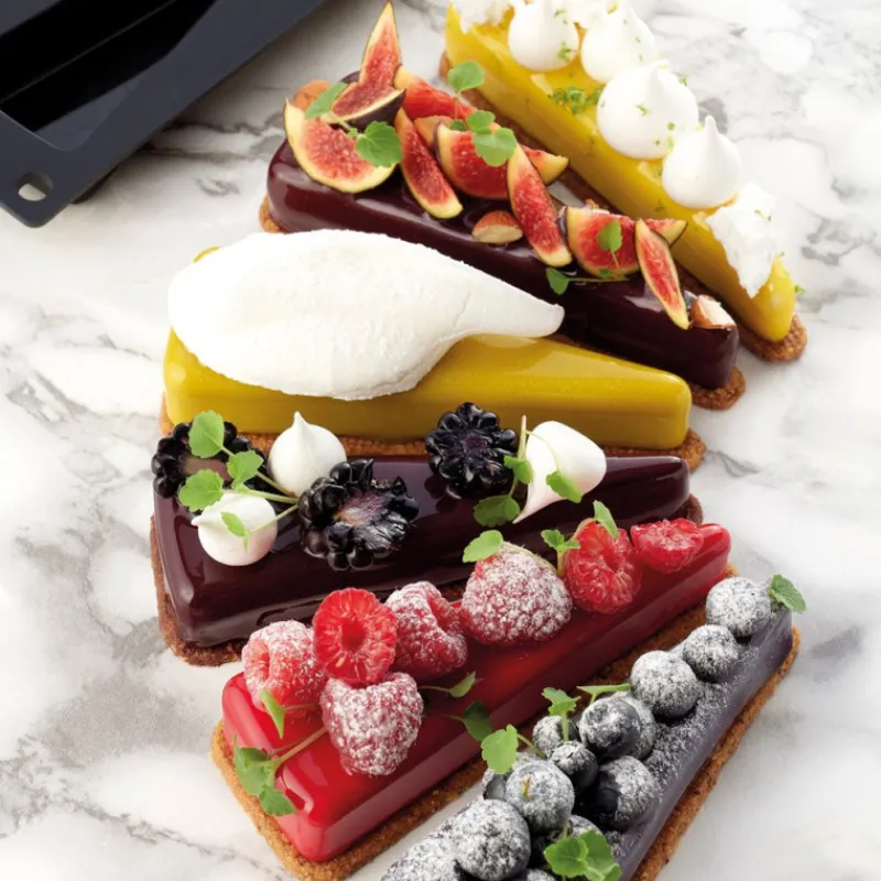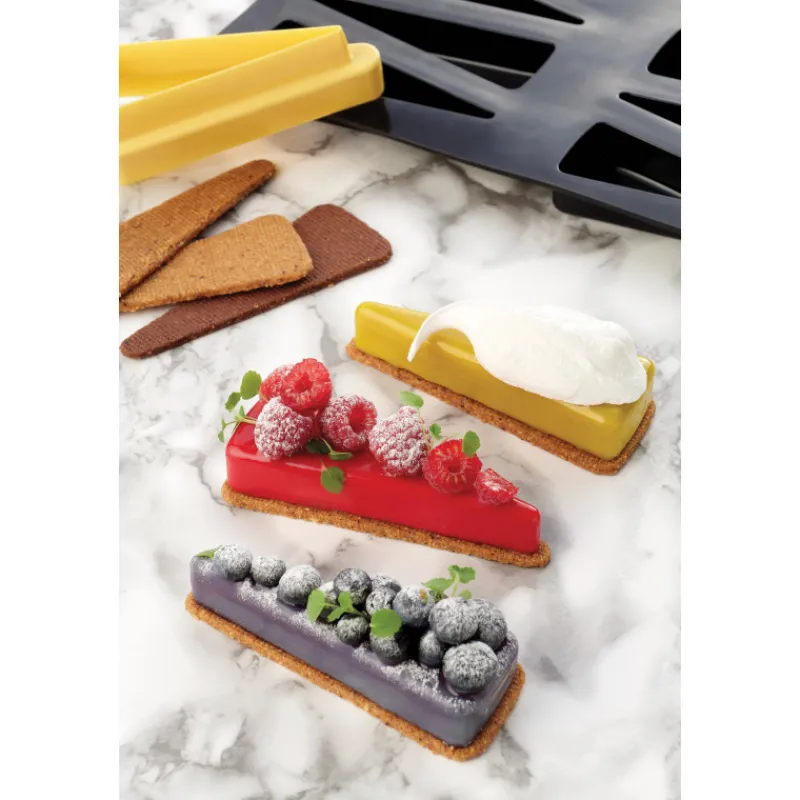 Pour un dessert original, servez des entremets déjà sous forme de parts grâce au Moule Silicone Slake imaginé par le chef pâtissier Nicolas Bacheyre. D’une hauteur de 2 cm, chaque empreinte possède une forme triangulaire semblable à une part de gâteau de 11,4 x 3,9 cm.