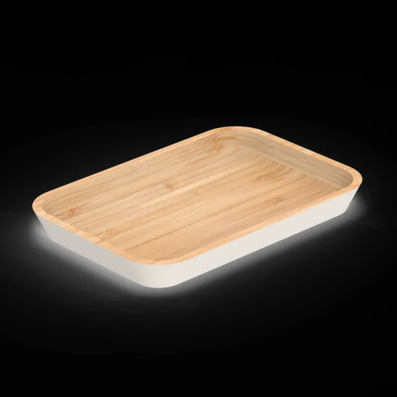 Avec ses bords fins et épurés, ce plateau est à la fois chic et pratique. Sa forme rectangulaire et son coloris bois naturel associé à une douce teinte crème en font l’accessoire parfait pour mettre en valeur vos mets préférés.