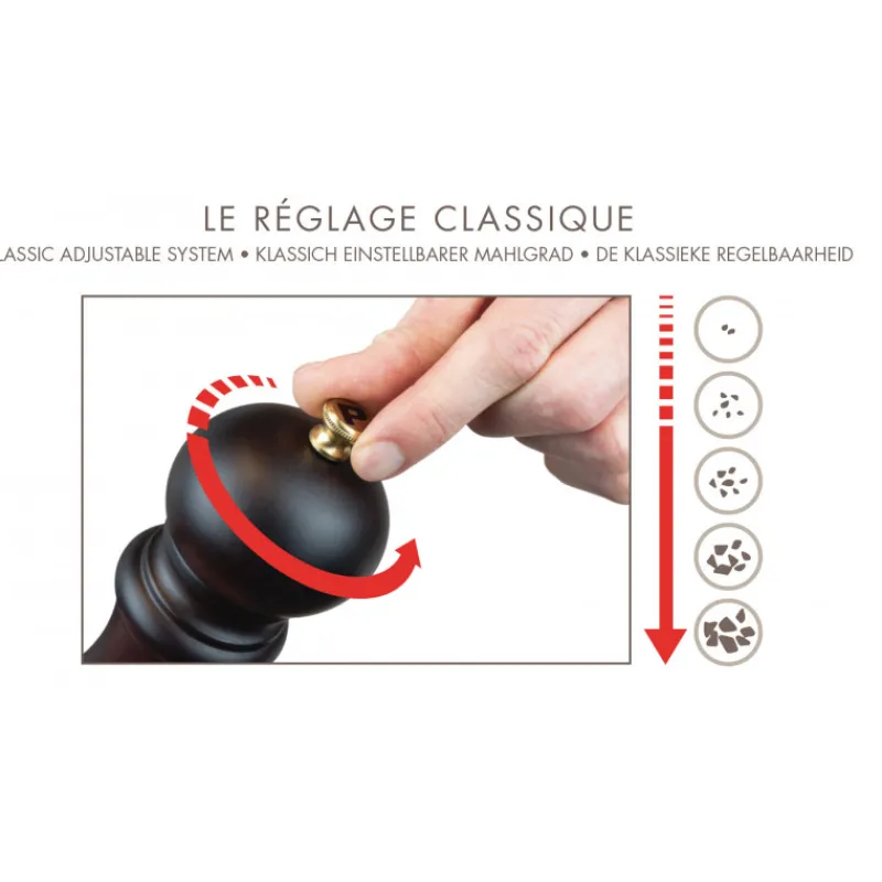Le moulin à poivre et le moulin à sel Peugeot sont coiffés d’un bouton en acier brossé qui permet de régler la mouture. Plus le bouton est serré, plus la mouture est fine, et inversement.
