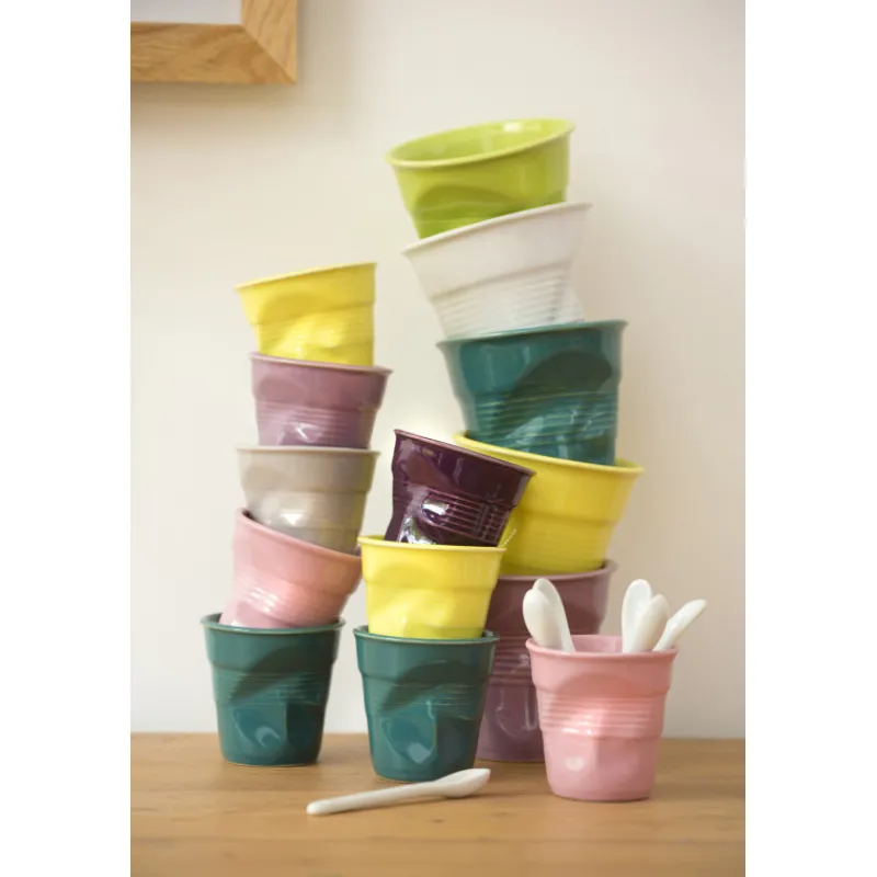 Les Froissés : Cette collection originale détourne un gobelet en plastique froissé en porcelaine. Les articles froissés Revol sont à la fois des accessoires de décoration mais également des ustensiles de cuisson! Le modèle du gobelet froissé Revol existe depuis l’année 2000 et n’a pas pris une ride!