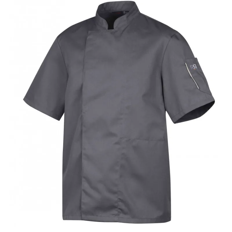 La veste de cuisine Robur se ferme par une rangée de boutons pressions cachés. Elle se pare d’un col officier, de manches courtes et d’une poche stylo cousue sur l’une d’elles.