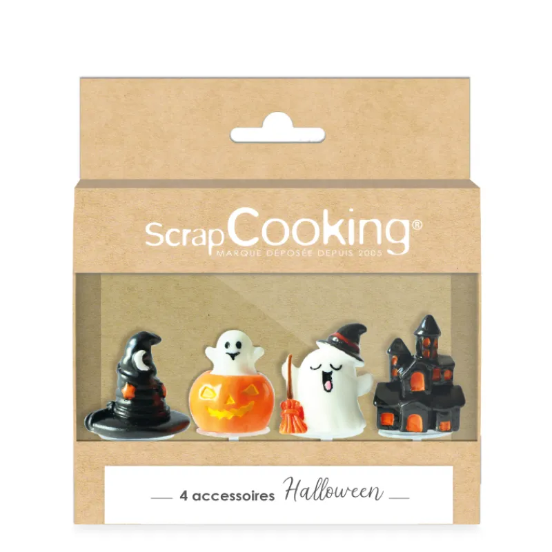 Ce lot de 4 accessoires Halloween est composé d’un fantôme, d’un chapeau de sorcier, d’un manoir hanté ainsi que d’une citrouille ensorcelée. Sur le thème Halloween, ces cake toppers de chez Scrapcooking seront parfaits pour sublimer vos gâteaux.