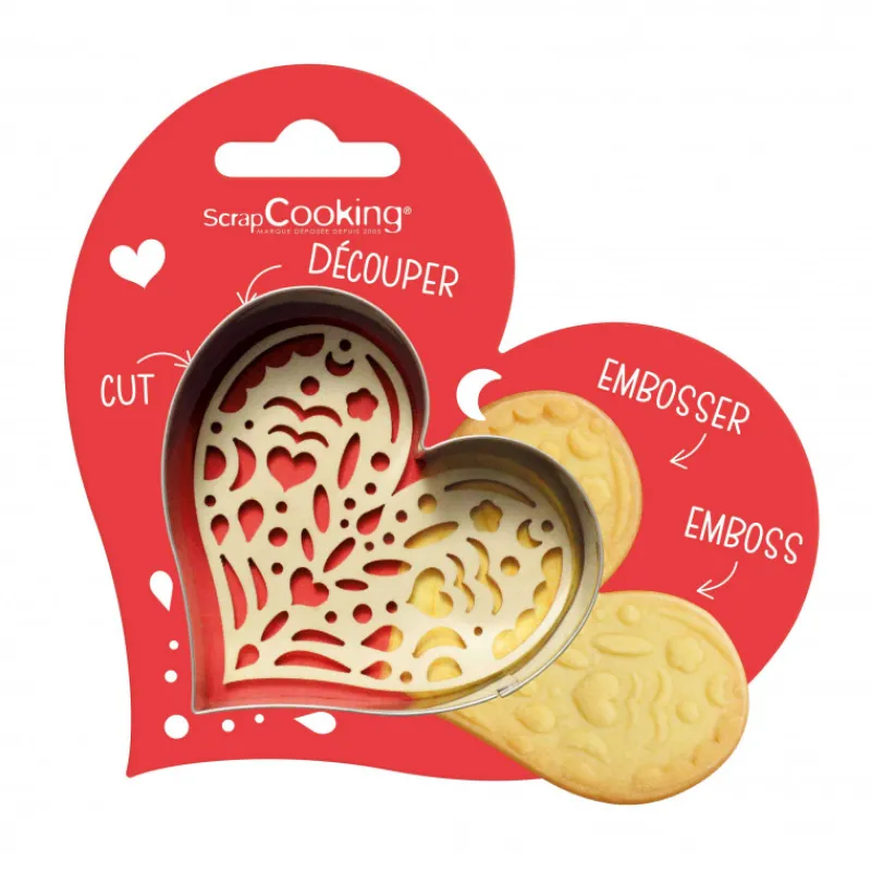 Pour montrer votre amour rien de tel qu’un cadeau gourmand ! Scrapcooking vous propose un kit à biscuit simple et élégant. Composé d’un découpoir en inox et d’un embosseur en forme de cœur, ce kit vous permet de décorer avec aisance vos biscuits et gâteaux. Ces deux ustensiles sont tout à fait adaptés au contact alimentaire, vous assurant ainsi une cuisine plus saine. En outre, l’emporte pièce cœur et son embosseur en bois ont un usage très simple : même vos bambins pourront participer à la confection de biscuits. Il vous suffit de détailler la forme générale de vos biscuits avec le découpoir cœur, puis de presser délicatement l’embosseur jusqu’à obtenir des reliefs ciselés.