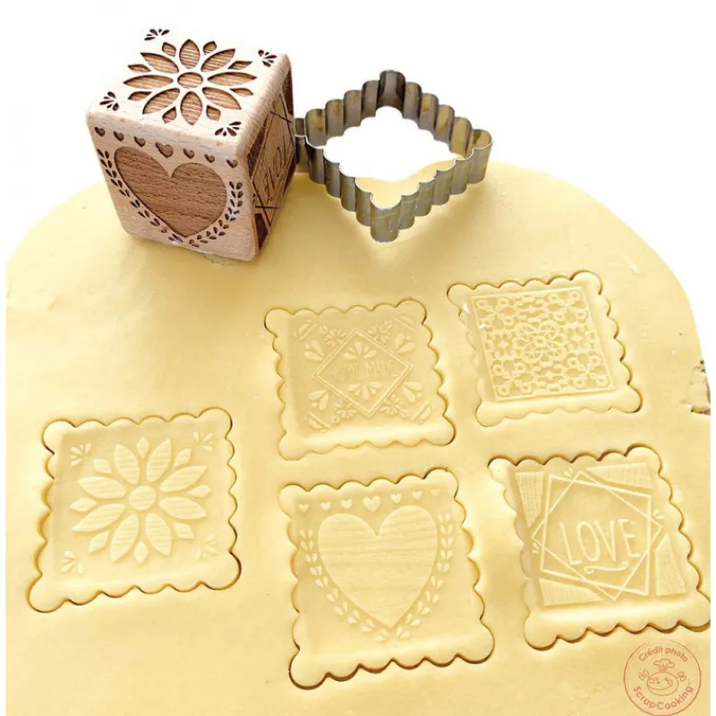 Ce cube en bois possède 5 faces avec des motifs différents pour diversifier et personnaliser vos décorations de biscuits. Le tampon en bois est accompagné d’un emporte-pièce carré cannelé spécialement conçu pour s’adapter aux dimensions du cube. Préparez votre pâte, positionnez le cube et appuyez dessus pour imprimer le motif choisi. Il suffit de découper votre biscuit avec l’emporte-pièces d’une simple pression et voilà !