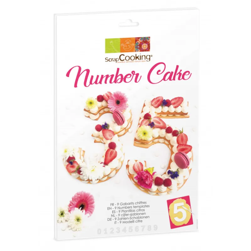 Pour confectionner de beaux Number Cakes, préparez votre biscuit, puis découpez, à l’aide d’un des gabarits, le chiffre que vous désirez en 2 exemplaires. Garnissez le premier Gâteau Chiffre de crème, recouvrez le du second biscuit que vous décorerez avec de la crème, des fleurs, des bonbons et toutes les décorations que vous souhaitez. Chaque Gabarit Scrapcooking mesurant 28 cm, vous obtiendrez donc de grands gâteaux en forme de chiffre.