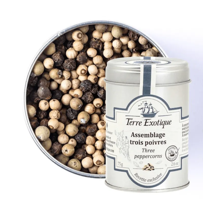 - Ingrédients : poivre blanc de Penja , poivre noir de Penja, poivre vert lyophilisé.