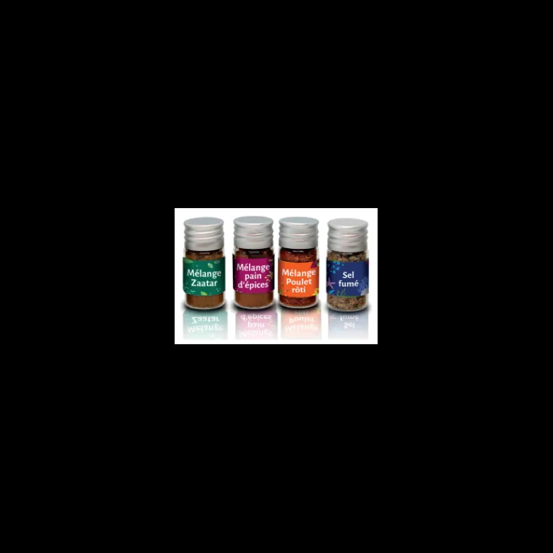 - Composition : Mélange Zaatar, noix de muscade, dip indien, sel rose fin à la truffe, mélange guacamole, mélange arrabiata, mélange poulet rôti, fleur de sel aux épices toastées, poivre noir de Kâmpôt, piment Kashmiri, sel dégustation foie gras, poivre noir fumé de Tellicherry, mélange cajun, quatre épices, baies de verveine, gingembre, poivre au citron pour poissons et fruits de mer, baies roses, curry breton, mélange pain d’épices, mélange crumble, mélange spéculoos, création pour desserts fruités.