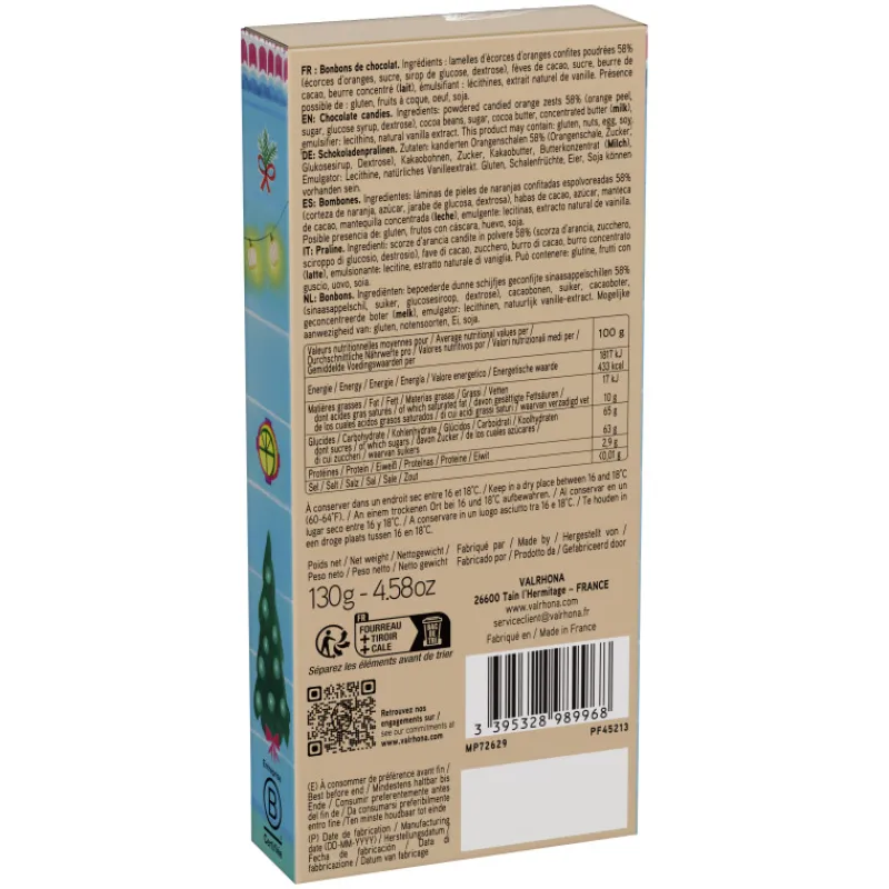 Fabriqué en France, ce coffret Valrhona contient des écorces d’oranges confites enrobées de chocolat noir. Cette association donnant des orangettes au chocolat saura faire plaisir à vos invités lors des fêtes de fin d’année et tout particulièrement à Noël.