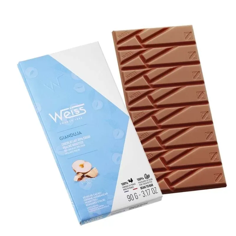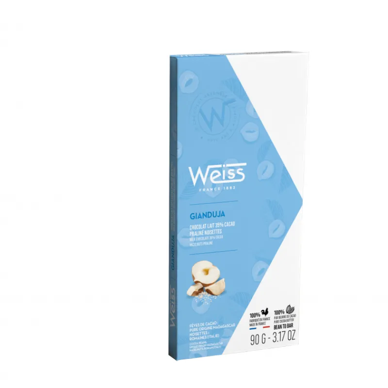Fabriquée en France, cette tablette chocolat de 90 g regroupe la gourmandise du praliné noisette et l’onctuosité du chocolat au lait pour une dégustation réconfortante et pleine de saveurs. Le Gianduja, et le chocolat Weiss tout court, raviront les palais de tous les gourmands à chaque occasion.