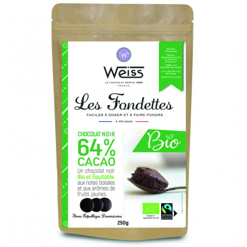 Pour un chocolat noir facile à doser et à travailler, optez pour le chocolat noir bio 64% Fondettes 250g Weiss pour obtenir des pâtisseries 100% gourmandes !