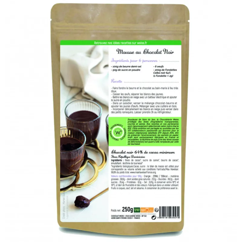 Chocolat Noir Bio 64% Fondettes 250g Weiss
