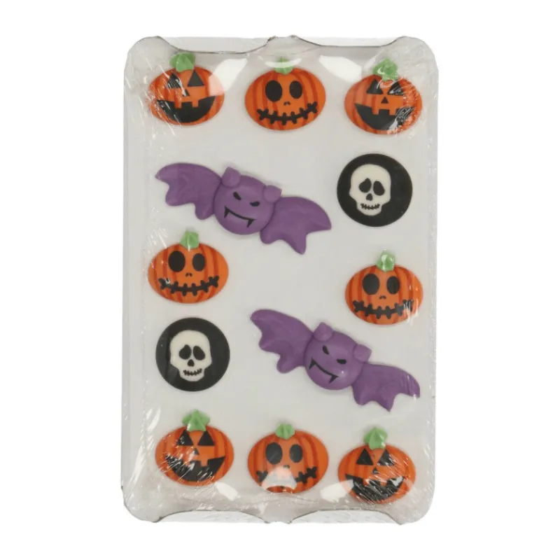 Ce kit de décoration comestible composé en glace royale apportera la touche bonbon halloween à vos pâtisseries. Ces 12 décorations gâteaux, sont déclinées en plusieurs formes à la fois effrayantes et amusantes. Ainsi vous trouverez citrouilles, chauves-souris et têtes de mort pour décorer vos succulents desserts halloween.